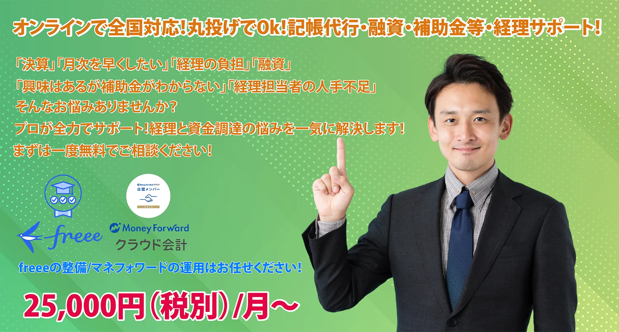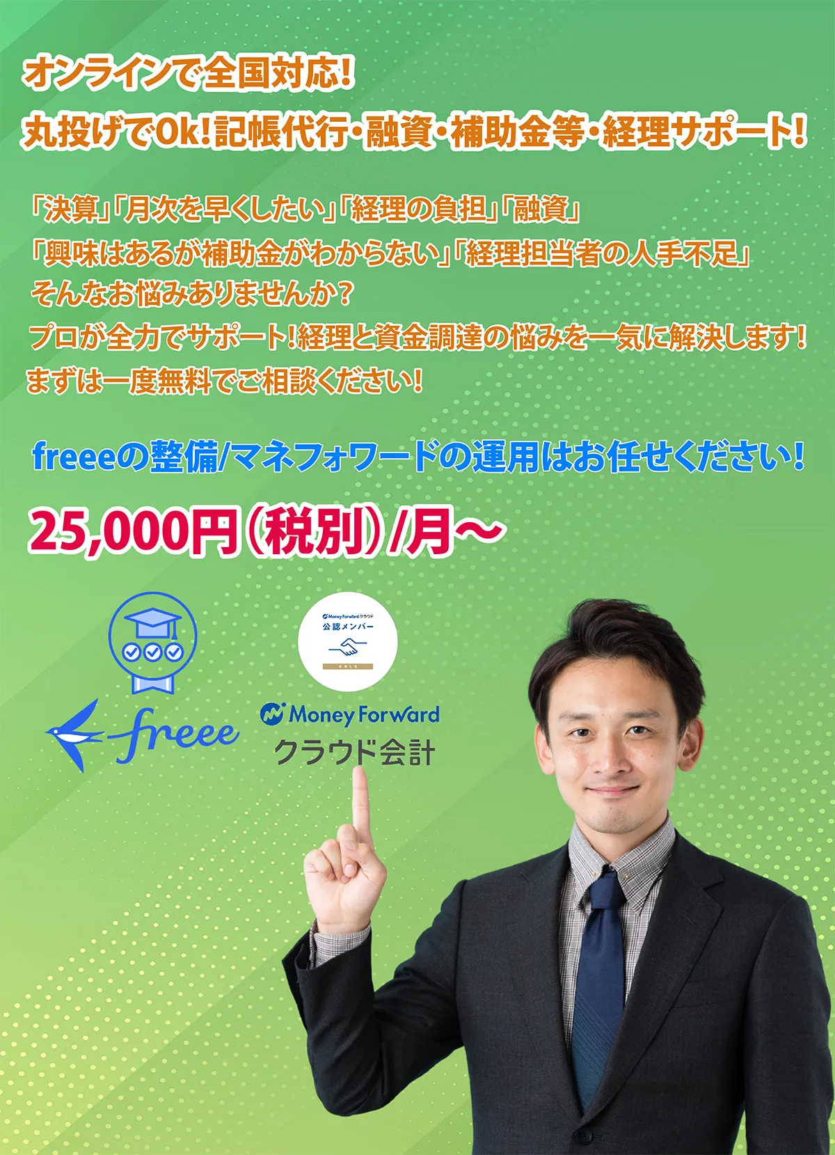 | ③ 経理効率化・バックオフィス支援 | 25,000円(税別)/月 | 300,000円(税別)/年間 | 経理効率化・バックオフィス支援だけご利用の場合は、左記金額となります。 |